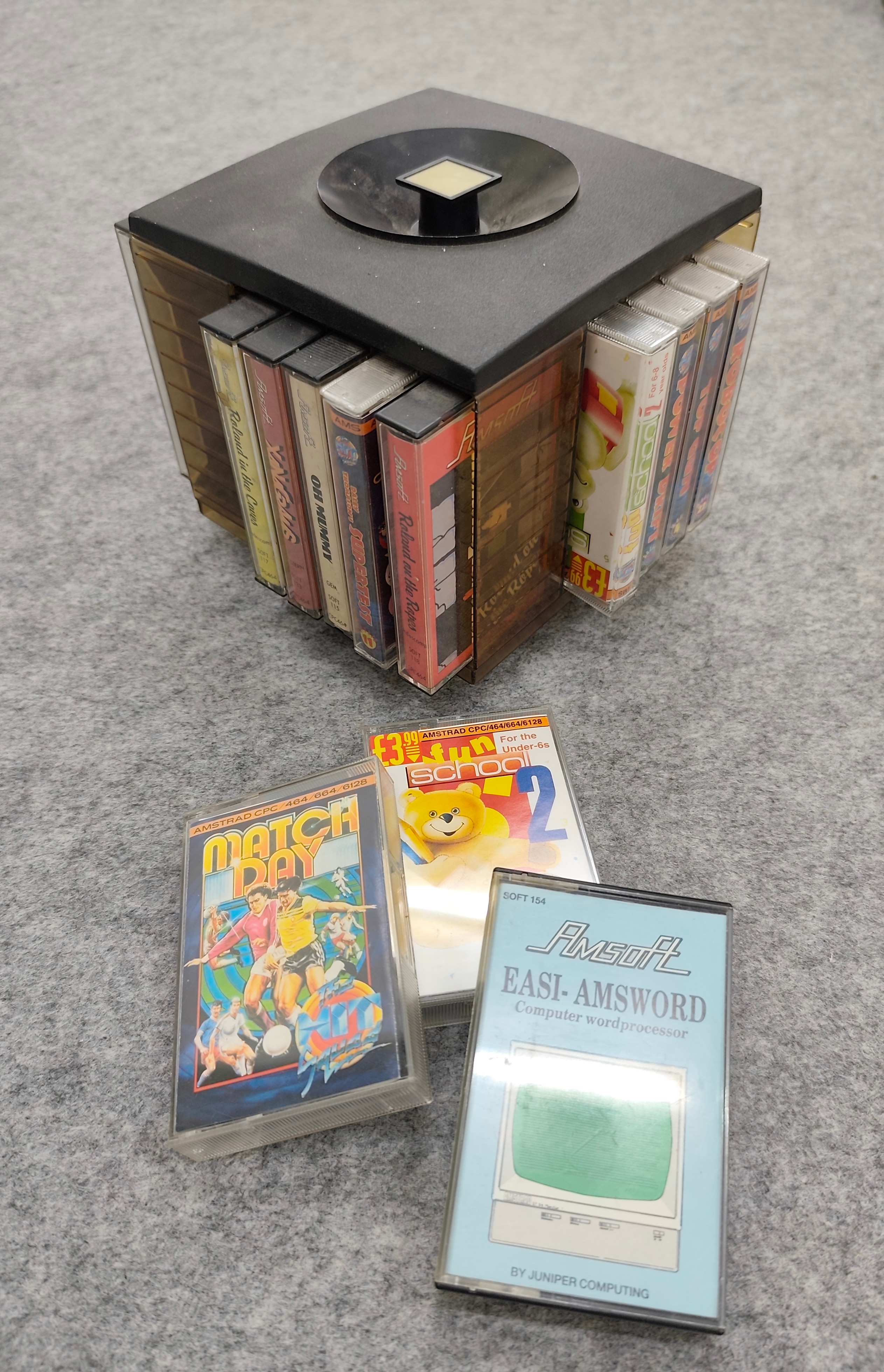 Auch so ein Ding das keiner mehr kennt: Kassetten-Boxen. Hier ein drehbares Rondell. Ein Vorteil von Kompaktkassetten as Speichermedium war die unglaubliche Vielfalt an Zubehör zur Aufbewahrung wie z.B. das hier mit Schneider CPC-Software bestückte Rondell.